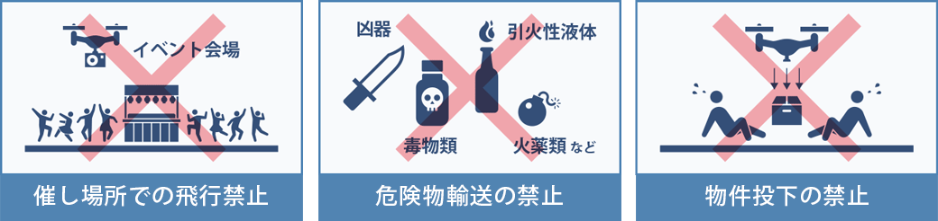 ・日中(日出から日没まで)に飛行させること ・目視(ドローンが目で見える距離)の範囲内で飛行させること ・建物や人などとドローンとの距離を最低30メートル確保すること ・催し場所など人が集まる場所で飛行させないこと ・危険物などの輸送を行わない ・物を投下してはならない